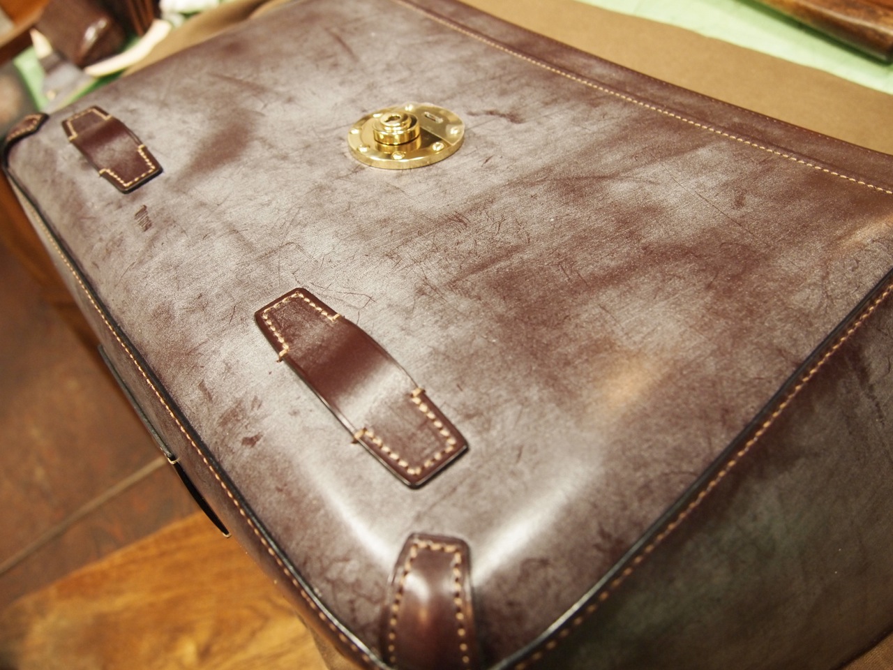 以前お作りしたクリスペルカーフのブリーフケース。お使い下さっているお客様が手にしてお立ち寄り下さいました。当工房の鞄を幾つかお使い頂いているお客様で、その時々靴や洋服と合わせてローテーションを組まれているご様子。革も馴染みご愛用頂いているのが伝わります。負荷が掛かる下部のコバ。どうしても加重でしなっ...