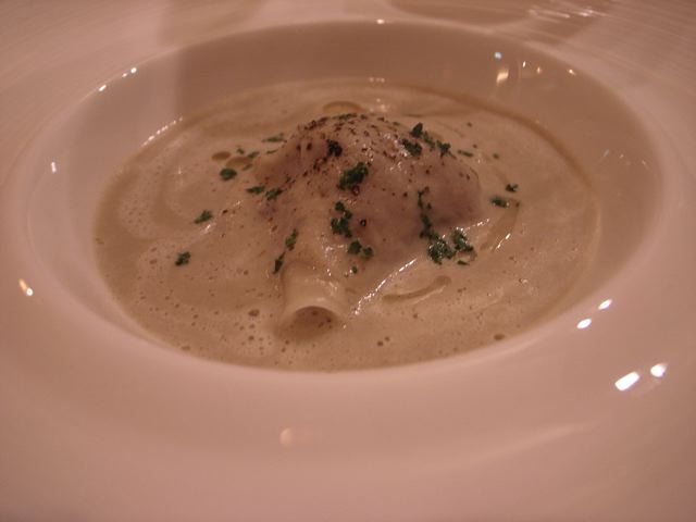 フランス産鴨のラヴィオリが入ったゴボウの温かいスープ ほんのりトリュフの香り