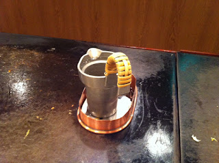 途中で芋焼酎の水割りをいただき、こんな感じで鉄板の横でチロリを暖めながら頂きました。(写真は、お湯からあげたところ)