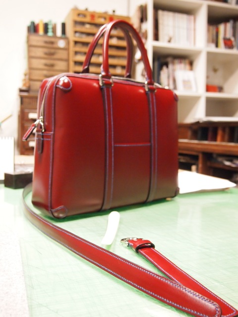 掛かりっきりの手縫いのファスナーブリーフケース。ショルダーストラップも縫い終わり、ナスカンを縫い留めればほぼ出来上がりです。