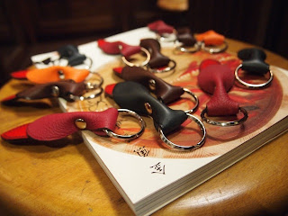 なかば時間つぶし的に手元にあった小さな革をひねったりしながら漠然と形を考えていました・・・・そんななか、ちょっとした思いつきをまとめてみたらとてもキュートなキーホルダーになったのです。