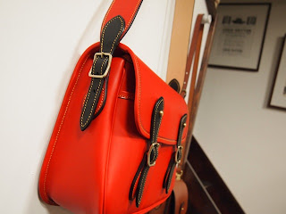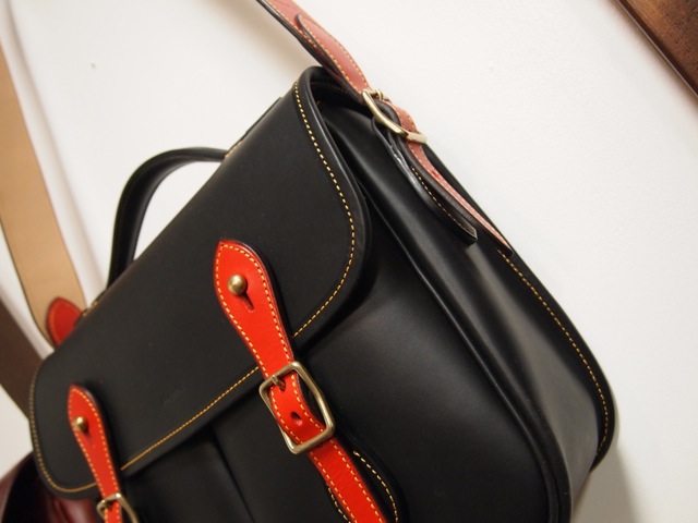 こちらは本体が赤でフラップを留めるベロが黒。ストラップの剣先部分も黒。