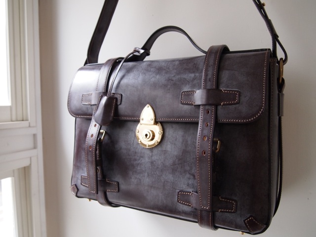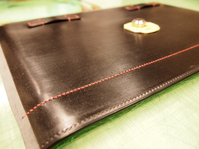 これはブライドルレザーのバーガンディー。仕立はミシン縫いと手縫いの併用の仕立。 定番品として展開しています。とは言え在庫切れの状態でいますが・・・・