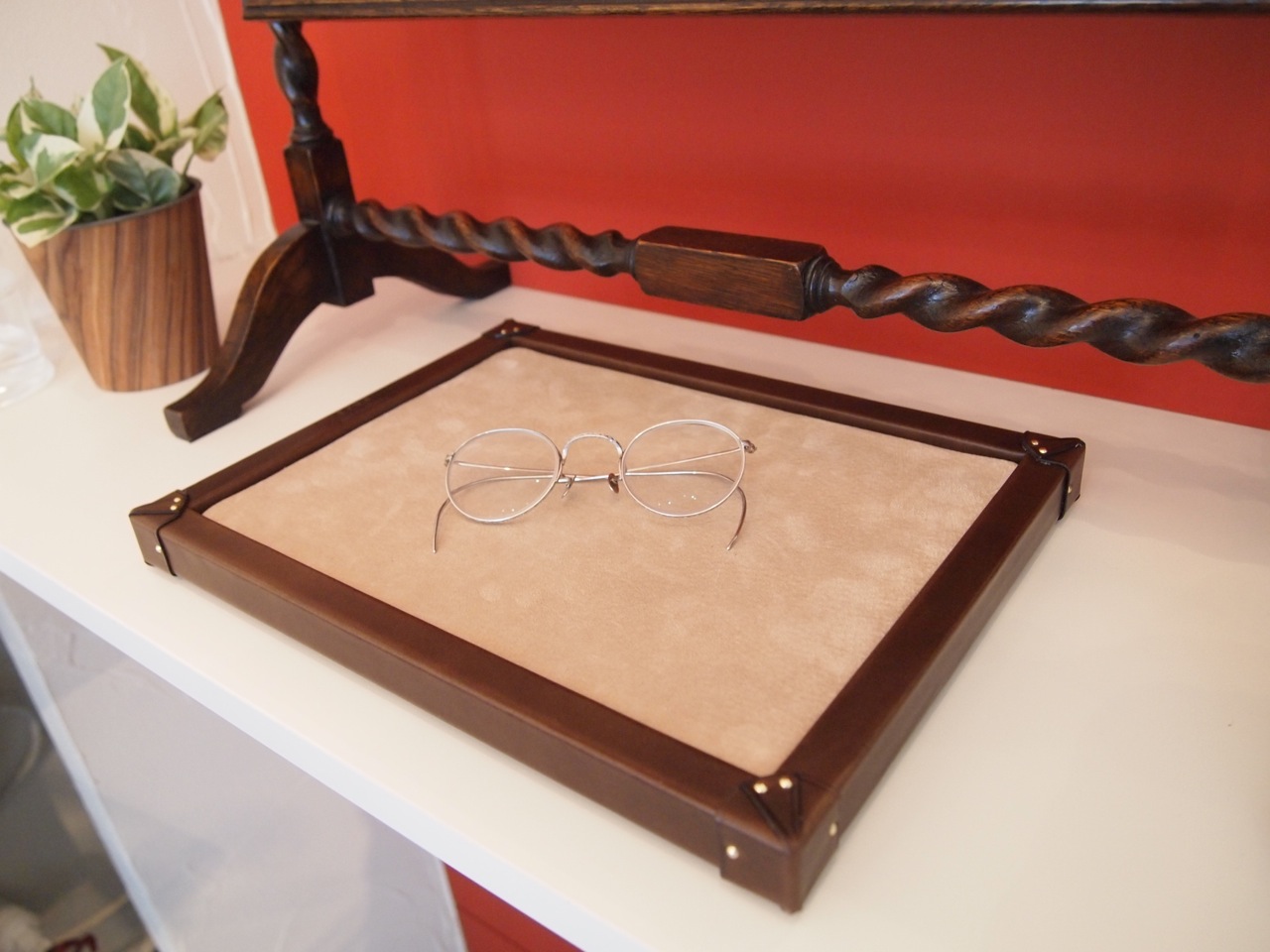 チョコのブッテーロでフレームを作り、眼鏡を置く部分はクッション入りのピッグスエード。