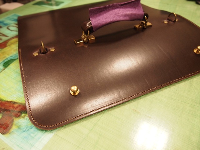 取り掛かっているA4サイズのブリーフケース。前胴と襠が組み上がりました。