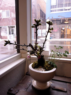 お店に飾っている旭山桜の盆栽が咲きつつあります。